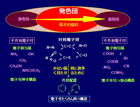 染料の構造において、この沢山の動きやすい電子を持つBodyを「発色団」と言い、その電子を動かすための道具を「助色団」と言います。